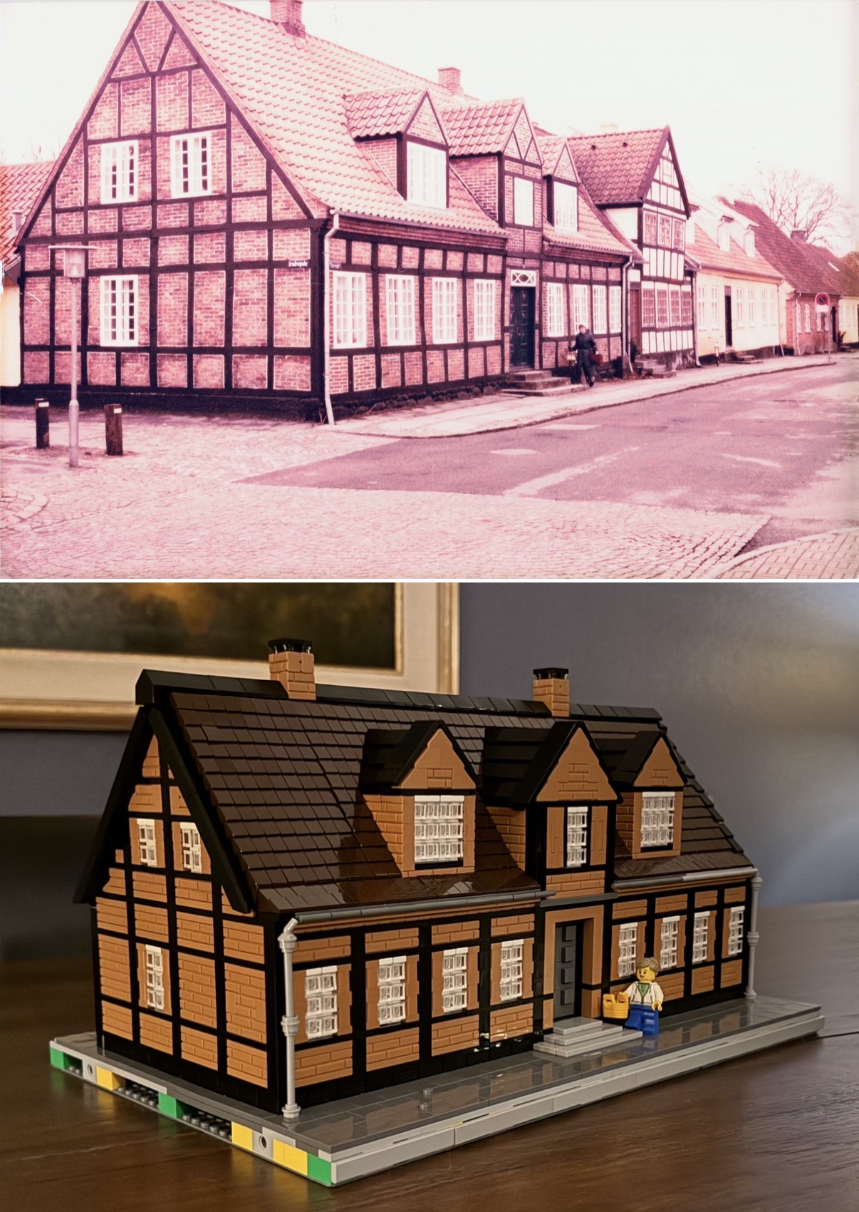 This model recreates a historic half-timbered building on the town square (“Torvet”) in Maribo, Denmark. My father grew up in one of the building’s three apartments from the 1930s through the 1950s, and my grandmother lived there until around 1990. The reference photo (1980s) came from a brochure; the inclusion of my grandmother’s caretaker, Jette, was purely coincidental. This LEGO model is a tribute to my family’s history and to the enduring character of traditional Danish architecture.