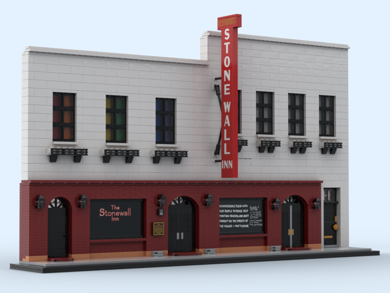 This is a minifigure-scale model of the façade of Stonewall Inn, a bar in Greenwich Village, New York City, and birthplace of the modern LGBTQIA2S+ Rights Movement. The red vertical sign is as it was on the fateful day in the summer of 1969, when a routine police raid resulted in a riot begun by transgender patrons of the bar. The graffiti on the right window is authentic to the days following the riots, and the window decor and neon sign on the left is how the bar appears today.