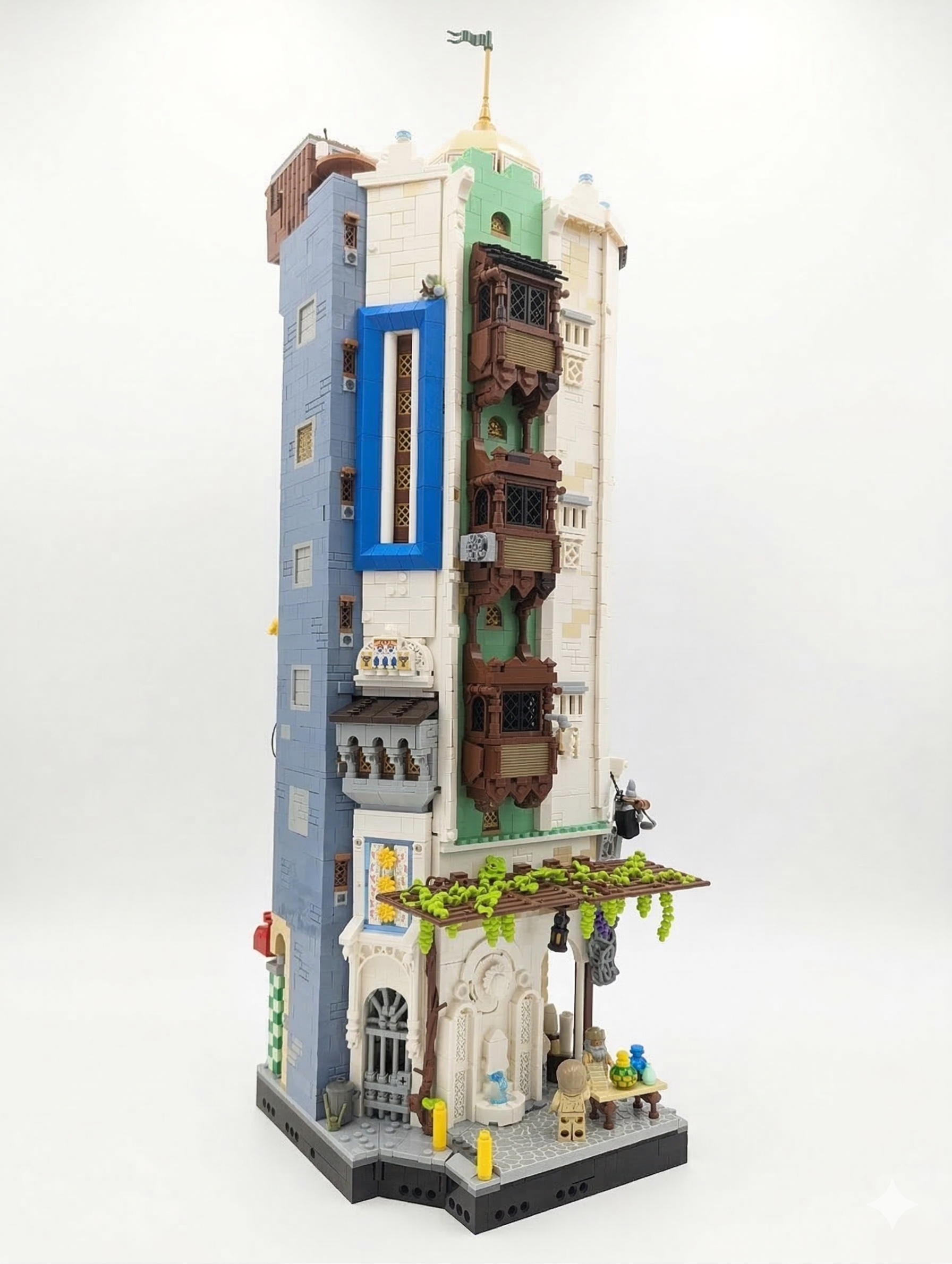The Mejeri of Al Medina is a mixed-use building designed in a traditional Islamic architectural style. Set in the fictional North African city Medina Al Musawrah in the 1970's, this building was one of dozens constructed for a group collaboration at Brickfair Virginia in August of 2025. This particular lot is an irregular shaped wedge with 8 sides, and was selected for the unique opportunity to feature a multitude of detailed building façades.