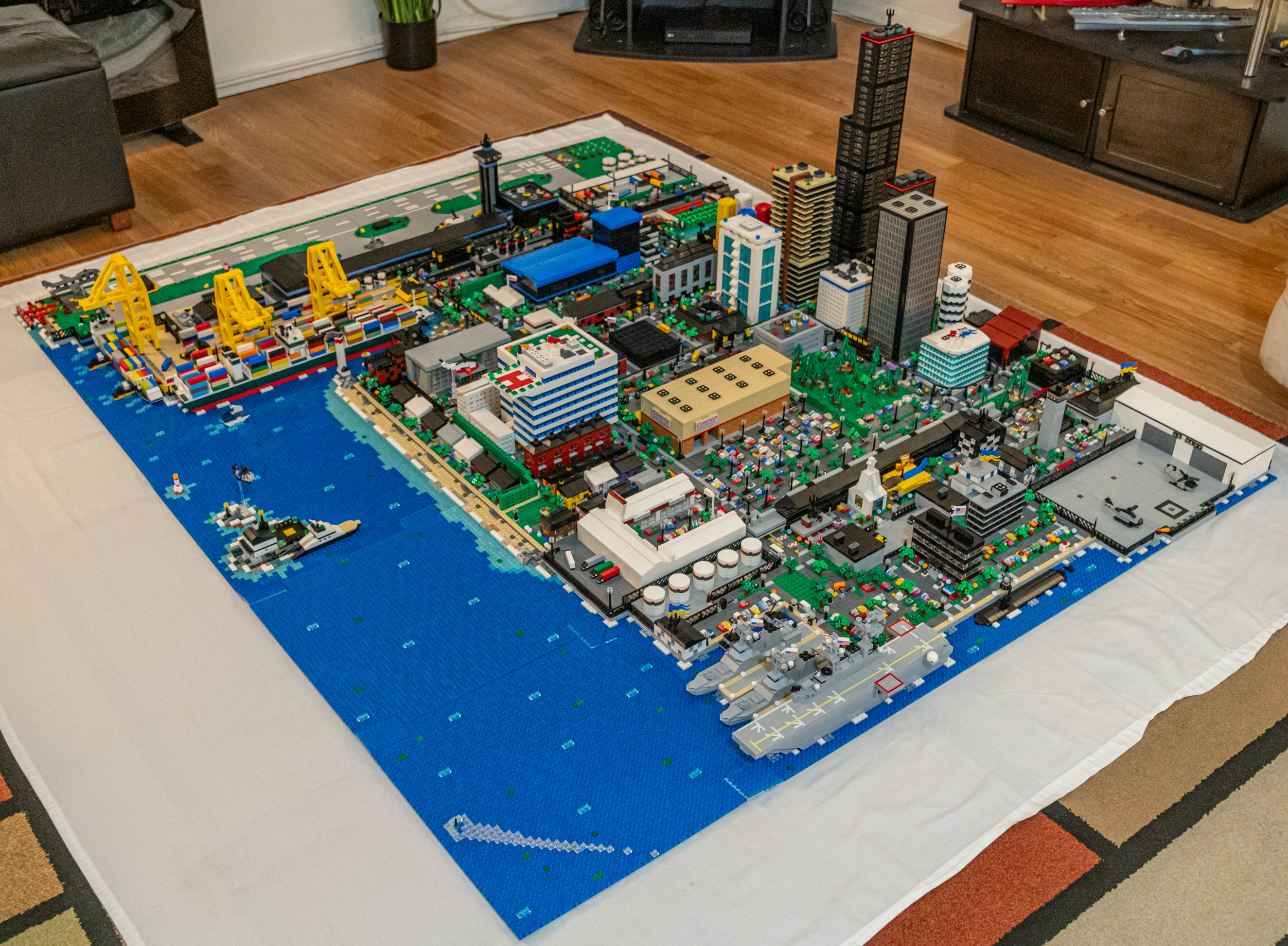 "Fredbricksburg" is a microscale rendering of a make-believe city. This city features an airport; a shipping port; a thriving shopping district; a downtown core with skyscrapers and public parks; a comprehensive transportation network complete with railroad, cars, trucks, monorail and traffic signals; public education facilities and stadiums; a hospital; a convention center/hotel; a US Navy base (with heliport); and other features. Design began in December, 2024 and construction wrapped up in March, 2026.