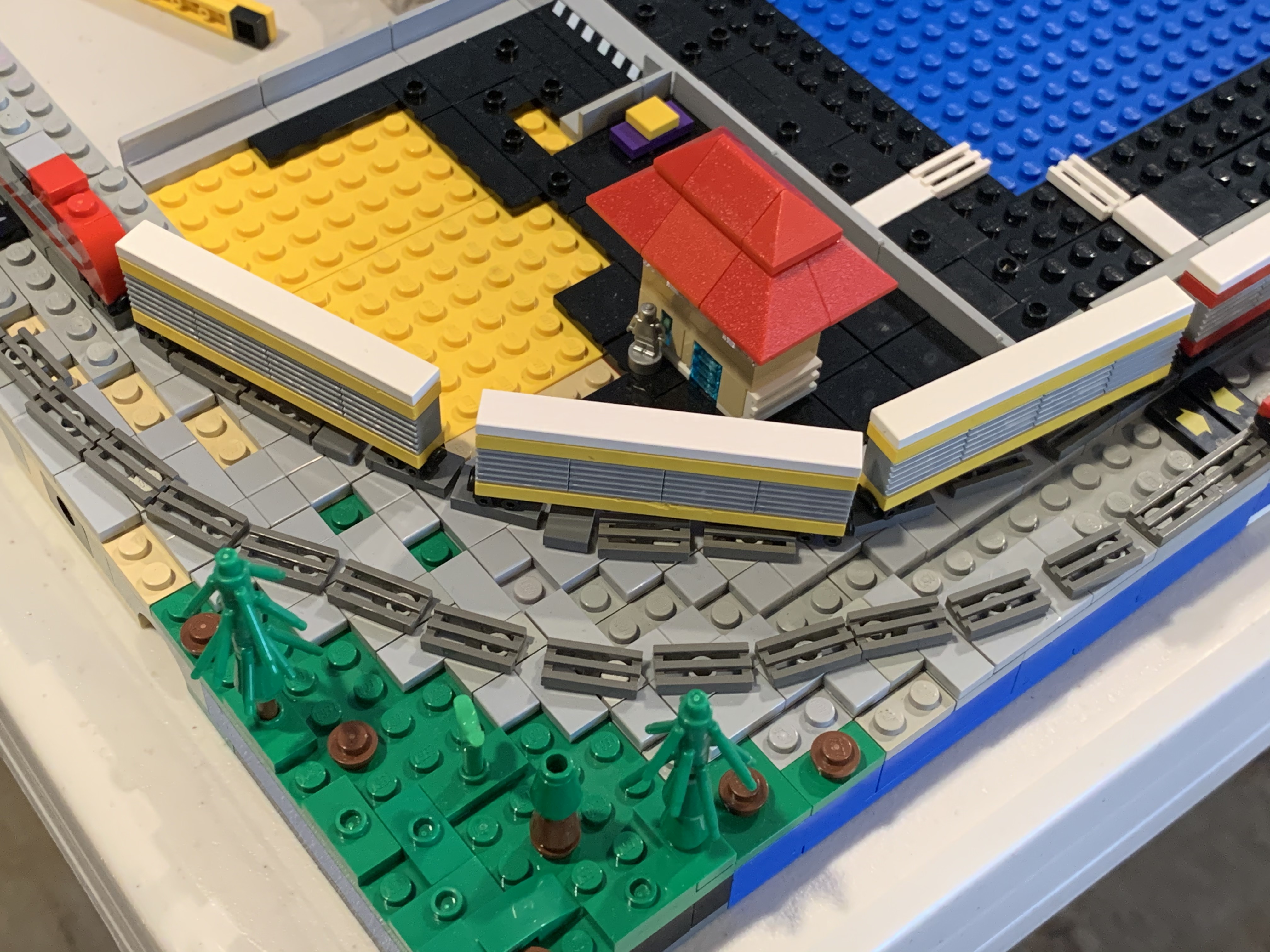 This model adapts the Micropolis Mainline to wrap around the new "Diamond District" blocks, (My control Tower was built to wrap around a rectangular city, Then "Dag" brought his first Diamond blocks, and I had to find a way to wrap around them. This was part of my COVID Project, building a modular mainline train that borders Micropolis.