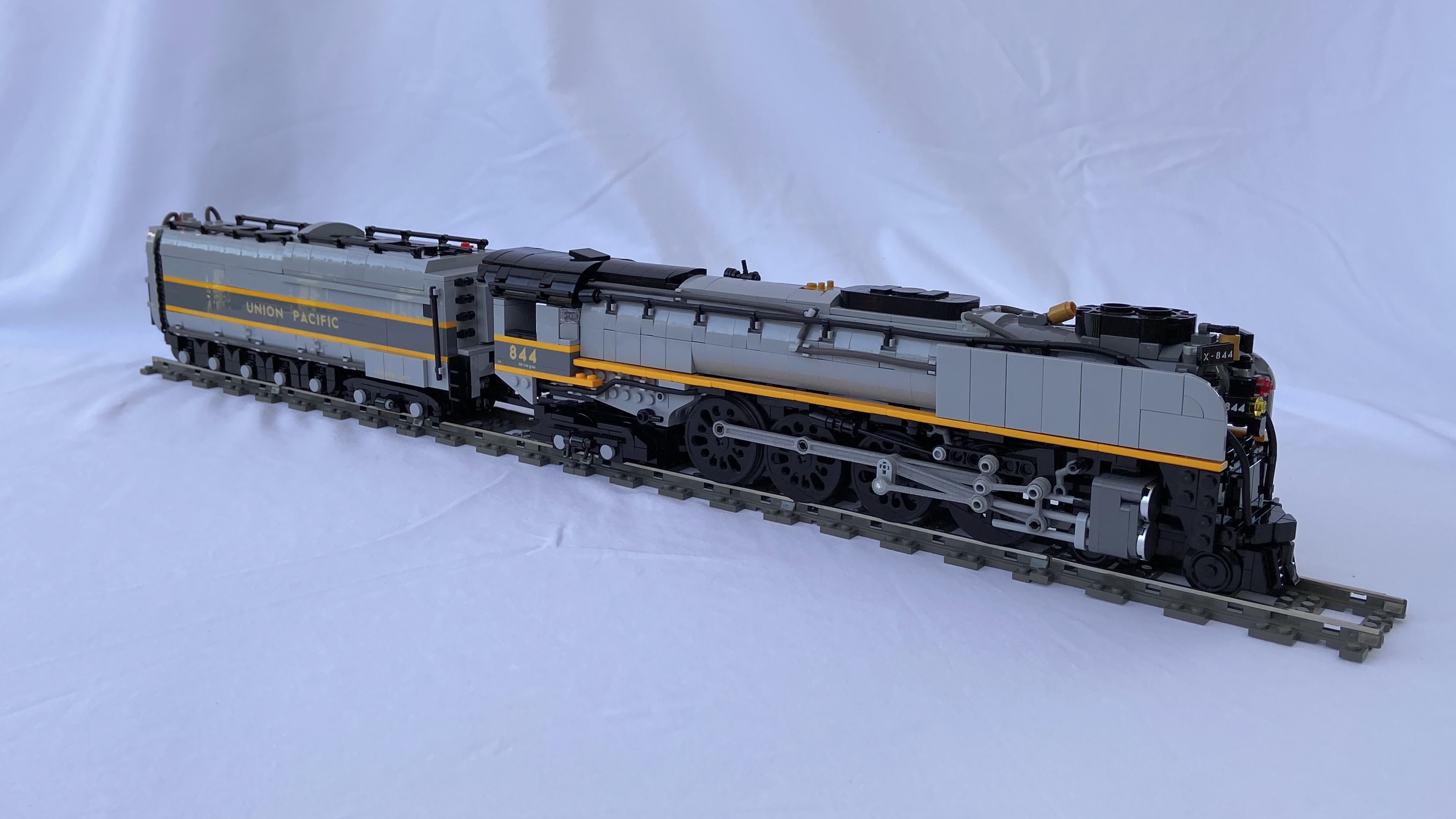 Union Pacific FEF-3 #844 – The Living Legend. Manufactured by the American Locomotive Company and delivered to UP in 1944, #844 was the last steam locomotive received by UP and the only steam locomotive of any American Class 1 railroad that has never been struck from the roster. Throughout her revenue career, she headed express freight, fast mail, and the most prestigious passenger trains of the central high plains and mountainous west. Over time she has received several modifications and upgrades, this build captures her high-speed passenger service essence and models her as she would have appeared in April of 1949 – oil burning, with a Sellers exhaust steam injector and painted in the famous two-tone gray.