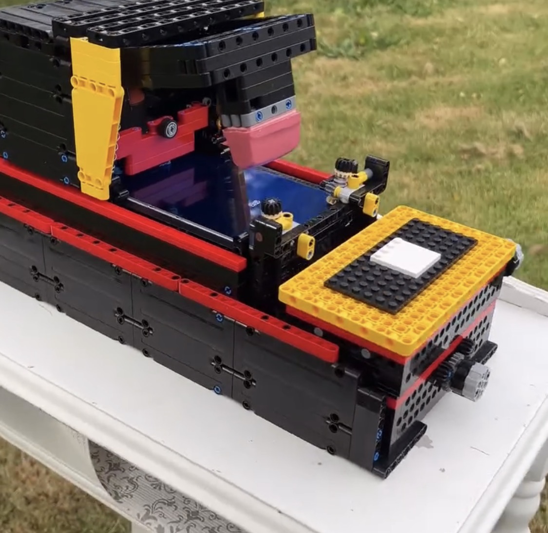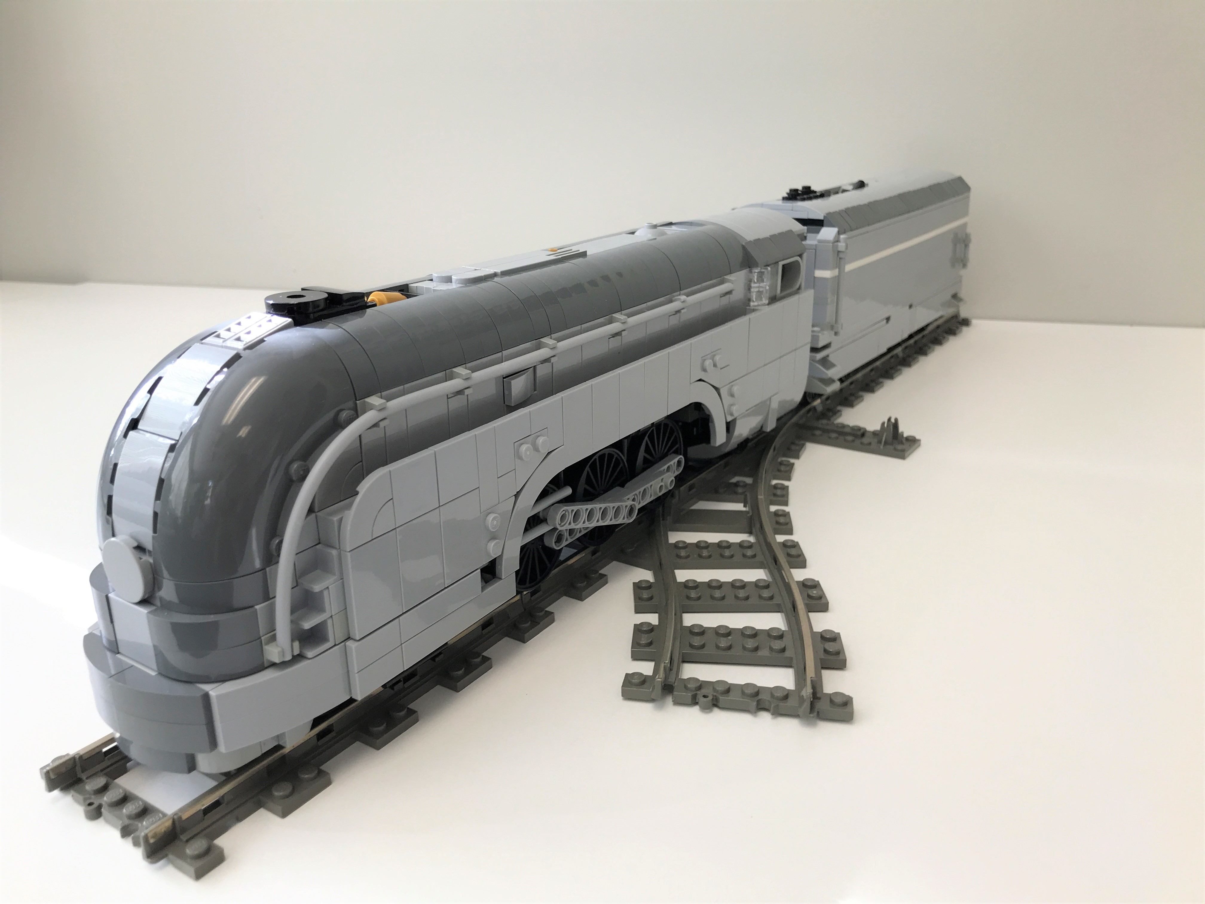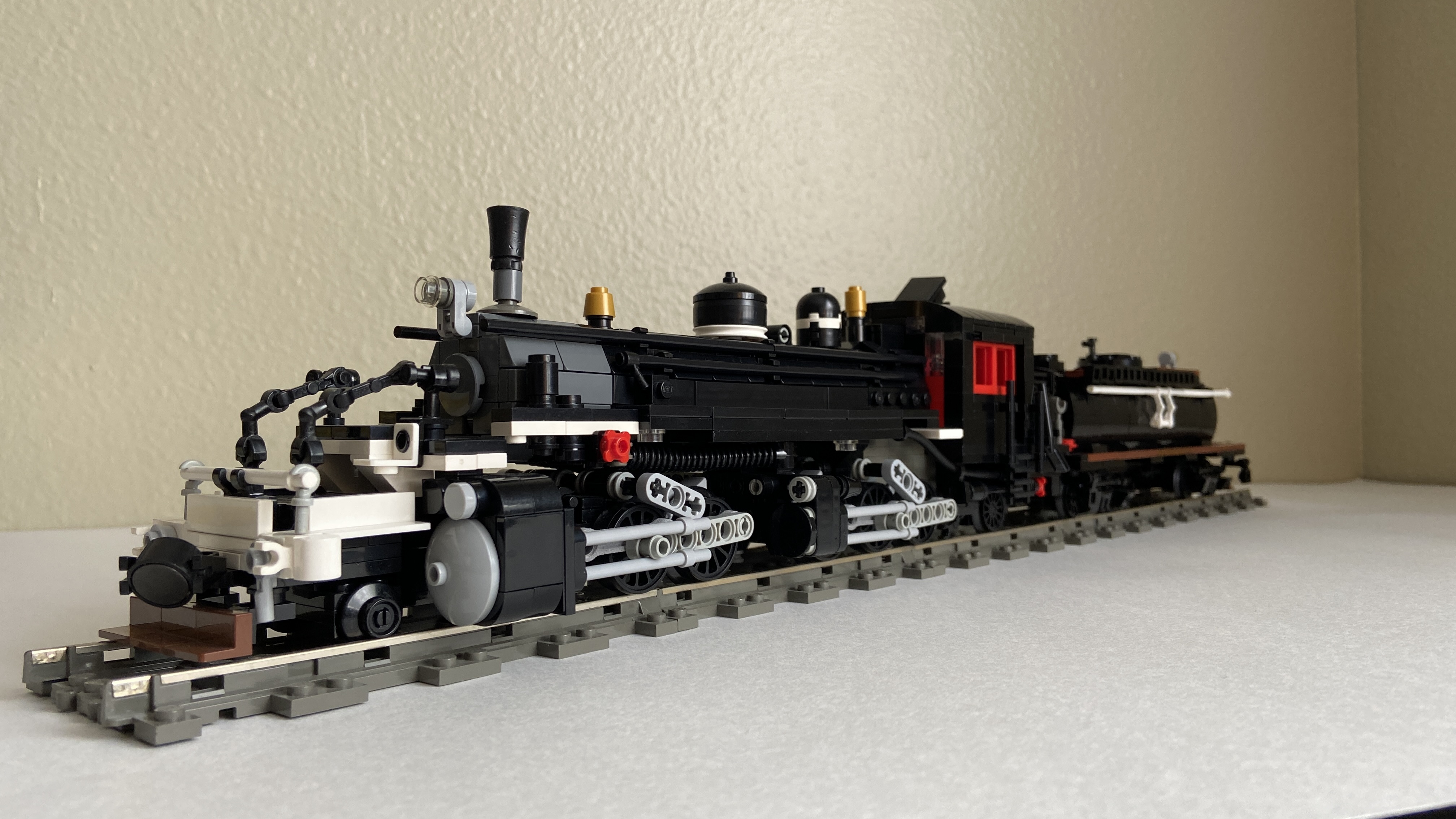 The model is 8-wide and 1:48 scale. It is powered by two L power function motors in a 1:1 gear ratio so that she has both high tractive effort and can travel at high speed. The tender is fitted with a battery pack, a power functions control switch and two V2 IR receivers with one dedicated to each motor.